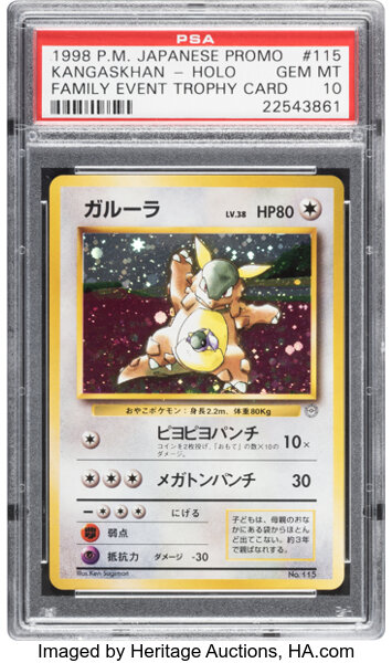 Il Kangaskhan Trophy è una delle carte premio più antiche del circuito competitivo giapponese, distribuita ai partecipanti di un torneo pensato per genitori e figli nel 1997 — un anno prima che il gioco uscisse ufficialmente in Occidente. Come tutte le carte trofeo, non è mai stata disponibile in nessun prodotto sealed al pubblico. La sua storia è talmente specifica da renderla unica anche tra i pezzi da torneo.